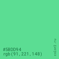 Цвет #5BDD94 в цветовой модели RGB обозначается тремя октетами (91, 221, 148) в десятичном формате и #5BDD94 в шестнадцатиричном (hex) формате, которые являются интенсивностью красного 91 (hex 5B), интенсивность зелёного 221 (hex DD) и интенсивность синего 148 (hex 94).
