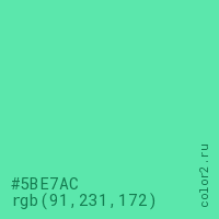 Цвет #5BE7AC в цветовой модели RGB обозначается тремя октетами (91, 231, 172) в десятичном формате и #5BE7AC в шестнадцатиричном (hex) формате, которые являются интенсивностью красного 91 (hex 5B), интенсивность зелёного 231 (hex E7) и интенсивность синего 172 (hex AC).