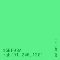 Цвет #5BF08A в цветовой модели RGB обозначается тремя октетами (91, 240, 138) в десятичном формате и #5BF08A в шестнадцатиричном (hex) формате, которые являются интенсивностью красного 91 (hex 5B), интенсивность зелёного 240 (hex F0) и интенсивность синего 138 (hex 8A).