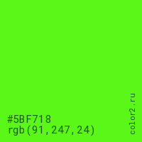 Цвет #5BF718 в цветовой модели RGB обозначается тремя октетами (91, 247, 24) в десятичном формате и #5BF718 в шестнадцатиричном (hex) формате, которые являются интенсивностью красного 91 (hex 5B), интенсивность зелёного 247 (hex F7) и интенсивность синего 24 (hex 18).
