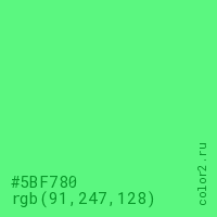 Цвет #5BF780 в цветовой модели RGB обозначается тремя октетами (91, 247, 128) в десятичном формате и #5BF780 в шестнадцатиричном (hex) формате, которые являются интенсивностью красного 91 (hex 5B), интенсивность зелёного 247 (hex F7) и интенсивность синего 128 (hex 80).