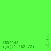 Цвет #5BFC48 в цветовой модели RGB обозначается тремя октетами (91, 252, 72) в десятичном формате и #5BFC48 в шестнадцатиричном (hex) формате, которые являются интенсивностью красного 91 (hex 5B), интенсивность зелёного 252 (hex FC) и интенсивность синего 72 (hex 48).