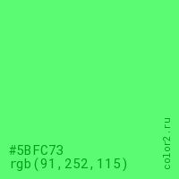 Цвет #5BFC73 в цветовой модели RGB обозначается тремя октетами (91, 252, 115) в десятичном формате и #5BFC73 в шестнадцатиричном (hex) формате, которые являются интенсивностью красного 91 (hex 5B), интенсивность зелёного 252 (hex FC) и интенсивность синего 115 (hex 73).