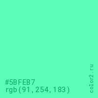 Цвет #5BFEB7 в цветовой модели RGB обозначается тремя октетами (91, 254, 183) в десятичном формате и #5BFEB7 в шестнадцатиричном (hex) формате, которые являются интенсивностью красного 91 (hex 5B), интенсивность зелёного 254 (hex FE) и интенсивность синего 183 (hex B7).