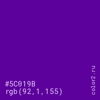 Цвет #5C019B в цветовой модели RGB обозначается тремя октетами (92, 1, 155) в десятичном формате и #5C019B в шестнадцатиричном (hex) формате, которые являются интенсивностью красного 92 (hex 5C), интенсивность зелёного 1 (hex 01) и интенсивность синего 155 (hex 9B).