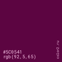Цвет #5C0541 в цветовой модели RGB обозначается тремя октетами (92, 5, 65) в десятичном формате и #5C0541 в шестнадцатиричном (hex) формате, которые являются интенсивностью красного 92 (hex 5C), интенсивность зелёного 5 (hex 05) и интенсивность синего 65 (hex 41).
