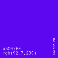 Цвет #5C07EF в цветовой модели RGB обозначается тремя октетами (92, 7, 239) в десятичном формате и #5C07EF в шестнадцатиричном (hex) формате, которые являются интенсивностью красного 92 (hex 5C), интенсивность зелёного 7 (hex 07) и интенсивность синего 239 (hex EF).