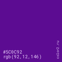 Цвет #5C0C92 в цветовой модели RGB обозначается тремя октетами (92, 12, 146) в десятичном формате и #5C0C92 в шестнадцатиричном (hex) формате, которые являются интенсивностью красного 92 (hex 5C), интенсивность зелёного 12 (hex 0C) и интенсивность синего 146 (hex 92).