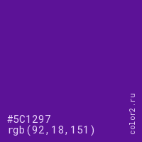 Цвет #5C1297 в цветовой модели RGB обозначается тремя октетами (92, 18, 151) в десятичном формате и #5C1297 в шестнадцатиричном (hex) формате, которые являются интенсивностью красного 92 (hex 5C), интенсивность зелёного 18 (hex 12) и интенсивность синего 151 (hex 97).