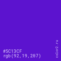 Цвет #5C13CF в цветовой модели RGB обозначается тремя октетами (92, 19, 207) в десятичном формате и #5C13CF в шестнадцатиричном (hex) формате, которые являются интенсивностью красного 92 (hex 5C), интенсивность зелёного 19 (hex 13) и интенсивность синего 207 (hex CF).
