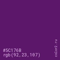 Цвет #5C176B в цветовой модели RGB обозначается тремя октетами (92, 23, 107) в десятичном формате и #5C176B в шестнадцатиричном (hex) формате, которые являются интенсивностью красного 92 (hex 5C), интенсивность зелёного 23 (hex 17) и интенсивность синего 107 (hex 6B).