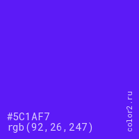 Цвет #5C1AF7 в цветовой модели RGB обозначается тремя октетами (92, 26, 247) в десятичном формате и #5C1AF7 в шестнадцатиричном (hex) формате, которые являются интенсивностью красного 92 (hex 5C), интенсивность зелёного 26 (hex 1A) и интенсивность синего 247 (hex F7).