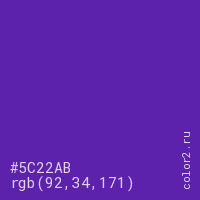 Цвет #5C22AB в цветовой модели RGB обозначается тремя октетами (92, 34, 171) в десятичном формате и #5C22AB в шестнадцатиричном (hex) формате, которые являются интенсивностью красного 92 (hex 5C), интенсивность зелёного 34 (hex 22) и интенсивность синего 171 (hex AB).