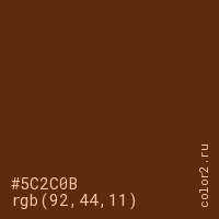 Цвет #5C2C0B в цветовой модели RGB обозначается тремя октетами (92, 44, 11) в десятичном формате и #5C2C0B в шестнадцатиричном (hex) формате, которые являются интенсивностью красного 92 (hex 5C), интенсивность зелёного 44 (hex 2C) и интенсивность синего 11 (hex 0B).