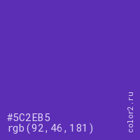 Цвет #5C2EB5 в цветовой модели RGB обозначается тремя октетами (92, 46, 181) в десятичном формате и #5C2EB5 в шестнадцатиричном (hex) формате, которые являются интенсивностью красного 92 (hex 5C), интенсивность зелёного 46 (hex 2E) и интенсивность синего 181 (hex B5).