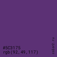Цвет #5C3175 в цветовой модели RGB обозначается тремя октетами (92, 49, 117) в десятичном формате и #5C3175 в шестнадцатиричном (hex) формате, которые являются интенсивностью красного 92 (hex 5C), интенсивность зелёного 49 (hex 31) и интенсивность синего 117 (hex 75).