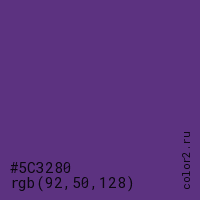 Цвет #5C3280 в цветовой модели RGB обозначается тремя октетами (92, 50, 128) в десятичном формате и #5C3280 в шестнадцатиричном (hex) формате, которые являются интенсивностью красного 92 (hex 5C), интенсивность зелёного 50 (hex 32) и интенсивность синего 128 (hex 80).