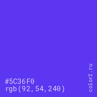Цвет #5C36F0 в цветовой модели RGB обозначается тремя октетами (92, 54, 240) в десятичном формате и #5C36F0 в шестнадцатиричном (hex) формате, которые являются интенсивностью красного 92 (hex 5C), интенсивность зелёного 54 (hex 36) и интенсивность синего 240 (hex F0).