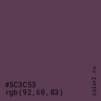 Цвет #5C3C53 в цветовой модели RGB обозначается тремя октетами (92, 60, 83) в десятичном формате и #5C3C53 в шестнадцатиричном (hex) формате, которые являются интенсивностью красного 92 (hex 5C), интенсивность зелёного 60 (hex 3C) и интенсивность синего 83 (hex 53).