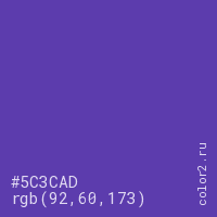 Цвет #5C3CAD в цветовой модели RGB обозначается тремя октетами (92, 60, 173) в десятичном формате и #5C3CAD в шестнадцатиричном (hex) формате, которые являются интенсивностью красного 92 (hex 5C), интенсивность зелёного 60 (hex 3C) и интенсивность синего 173 (hex AD).