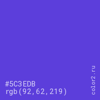 Цвет RGB(92, 62, 219) в процентом отношении количества цвета состоит из 36.1% красного (red), 24.3% зелёного (green) и 85.9% синего (blue).