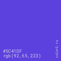 Цвет #5C41DF в цветовой модели RGB обозначается тремя октетами (92, 65, 223) в десятичном формате и #5C41DF в шестнадцатиричном (hex) формате, которые являются интенсивностью красного 92 (hex 5C), интенсивность зелёного 65 (hex 41) и интенсивность синего 223 (hex DF).