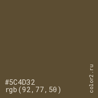 Цвет #5C4D32 в цветовой модели RGB обозначается тремя октетами (92, 77, 50) в десятичном формате и #5C4D32 в шестнадцатиричном (hex) формате, которые являются интенсивностью красного 92 (hex 5C), интенсивность зелёного 77 (hex 4D) и интенсивность синего 50 (hex 32).