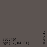 Цвет #5C5451 в цветовой модели RGB обозначается тремя октетами (92, 84, 81) в десятичном формате и #5C5451 в шестнадцатиричном (hex) формате, которые являются интенсивностью красного 92 (hex 5C), интенсивность зелёного 84 (hex 54) и интенсивность синего 81 (hex 51).