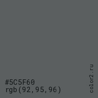 Цвет #5C5F60 в цветовой модели RGB обозначается тремя октетами (92, 95, 96) в десятичном формате и #5C5F60 в шестнадцатиричном (hex) формате, которые являются интенсивностью красного 92 (hex 5C), интенсивность зелёного 95 (hex 5F) и интенсивность синего 96 (hex 60).