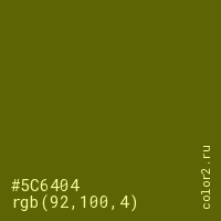 Цвет #5C6404 в цветовой модели RGB обозначается тремя октетами (92, 100, 4) в десятичном формате и #5C6404 в шестнадцатиричном (hex) формате, которые являются интенсивностью красного 92 (hex 5C), интенсивность зелёного 100 (hex 64) и интенсивность синего 4 (hex 04).