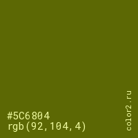 Цвет #5C6804 в цветовой модели RGB обозначается тремя октетами (92, 104, 4) в десятичном формате и #5C6804 в шестнадцатиричном (hex) формате, которые являются интенсивностью красного 92 (hex 5C), интенсивность зелёного 104 (hex 68) и интенсивность синего 4 (hex 04).