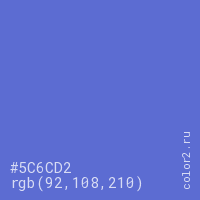 Цвет #5C6CD2 в цветовой модели RGB обозначается тремя октетами (92, 108, 210) в десятичном формате и #5C6CD2 в шестнадцатиричном (hex) формате, которые являются интенсивностью красного 92 (hex 5C), интенсивность зелёного 108 (hex 6C) и интенсивность синего 210 (hex D2).