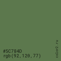Цвет #5C784D в цветовой модели RGB обозначается тремя октетами (92, 120, 77) в десятичном формате и #5C784D в шестнадцатиричном (hex) формате, которые являются интенсивностью красного 92 (hex 5C), интенсивность зелёного 120 (hex 78) и интенсивность синего 77 (hex 4D).