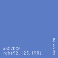 Цвет #5C7DC6 в цветовой модели RGB обозначается тремя октетами (92, 125, 198) в десятичном формате и #5C7DC6 в шестнадцатиричном (hex) формате, которые являются интенсивностью красного 92 (hex 5C), интенсивность зелёного 125 (hex 7D) и интенсивность синего 198 (hex C6).