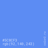 Цвет #5C8CF3 в цветовой модели RGB обозначается тремя октетами (92, 140, 243) в десятичном формате и #5C8CF3 в шестнадцатиричном (hex) формате, которые являются интенсивностью красного 92 (hex 5C), интенсивность зелёного 140 (hex 8C) и интенсивность синего 243 (hex F3).