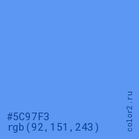 Цвет #5C97F3 в цветовой модели RGB обозначается тремя октетами (92, 151, 243) в десятичном формате и #5C97F3 в шестнадцатиричном (hex) формате, которые являются интенсивностью красного 92 (hex 5C), интенсивность зелёного 151 (hex 97) и интенсивность синего 243 (hex F3).