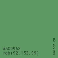 Цвет #5C9963 в цветовой модели RGB обозначается тремя октетами (92, 153, 99) в десятичном формате и #5C9963 в шестнадцатиричном (hex) формате, которые являются интенсивностью красного 92 (hex 5C), интенсивность зелёного 153 (hex 99) и интенсивность синего 99 (hex 63).