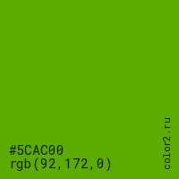 Цвет #5CAC00 в цветовой модели RGB обозначается тремя октетами (92, 172, 0) в десятичном формате и #5CAC00 в шестнадцатиричном (hex) формате, которые являются интенсивностью красного 92 (hex 5C), интенсивность зелёного 172 (hex AC) и интенсивность синего 0 (hex 00).