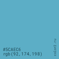 Цвет #5CAEC6 в цветовой модели RGB обозначается тремя октетами (92, 174, 198) в десятичном формате и #5CAEC6 в шестнадцатиричном (hex) формате, которые являются интенсивностью красного 92 (hex 5C), интенсивность зелёного 174 (hex AE) и интенсивность синего 198 (hex C6).