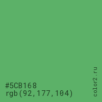 Цвет #5CB168 в цветовой модели RGB обозначается тремя октетами (92, 177, 104) в десятичном формате и #5CB168 в шестнадцатиричном (hex) формате, которые являются интенсивностью красного 92 (hex 5C), интенсивность зелёного 177 (hex B1) и интенсивность синего 104 (hex 68).