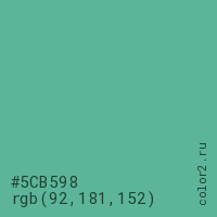 Цвет #5CB598 в цветовой модели RGB обозначается тремя октетами (92, 181, 152) в десятичном формате и #5CB598 в шестнадцатиричном (hex) формате, которые являются интенсивностью красного 92 (hex 5C), интенсивность зелёного 181 (hex B5) и интенсивность синего 152 (hex 98).