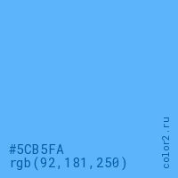 Цвет #5CB5FA в цветовой модели RGB обозначается тремя октетами (92, 181, 250) в десятичном формате и #5CB5FA в шестнадцатиричном (hex) формате, которые являются интенсивностью красного 92 (hex 5C), интенсивность зелёного 181 (hex B5) и интенсивность синего 250 (hex FA).
