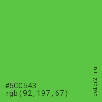 Цвет #5CC543 в цветовой модели RGB обозначается тремя октетами (92, 197, 67) в десятичном формате и #5CC543 в шестнадцатиричном (hex) формате, которые являются интенсивностью красного 92 (hex 5C), интенсивность зелёного 197 (hex C5) и интенсивность синего 67 (hex 43).