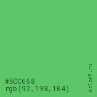 Цвет #5CC668 в цветовой модели RGB обозначается тремя октетами (92, 198, 104) в десятичном формате и #5CC668 в шестнадцатиричном (hex) формате, которые являются интенсивностью красного 92 (hex 5C), интенсивность зелёного 198 (hex C6) и интенсивность синего 104 (hex 68).