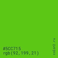 Цвет #5CC715 в цветовой модели RGB обозначается тремя октетами (92, 199, 21) в десятичном формате и #5CC715 в шестнадцатиричном (hex) формате, которые являются интенсивностью красного 92 (hex 5C), интенсивность зелёного 199 (hex C7) и интенсивность синего 21 (hex 15).