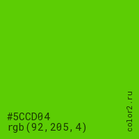 Цвет #5CCD04 в цветовой модели RGB обозначается тремя октетами (92, 205, 4) в десятичном формате и #5CCD04 в шестнадцатиричном (hex) формате, которые являются интенсивностью красного 92 (hex 5C), интенсивность зелёного 205 (hex CD) и интенсивность синего 4 (hex 04).