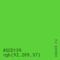 Цвет #5CD139 в цветовой модели RGB обозначается тремя октетами (92, 209, 57) в десятичном формате и #5CD139 в шестнадцатиричном (hex) формате, которые являются интенсивностью красного 92 (hex 5C), интенсивность зелёного 209 (hex D1) и интенсивность синего 57 (hex 39).