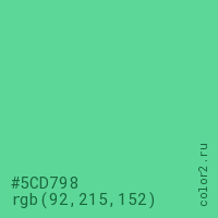 Цвет #5CD798 в цветовой модели RGB обозначается тремя октетами (92, 215, 152) в десятичном формате и #5CD798 в шестнадцатиричном (hex) формате, которые являются интенсивностью красного 92 (hex 5C), интенсивность зелёного 215 (hex D7) и интенсивность синего 152 (hex 98).