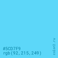 Цвет #5CD7F9 в цветовой модели RGB обозначается тремя октетами (92, 215, 249) в десятичном формате и #5CD7F9 в шестнадцатиричном (hex) формате, которые являются интенсивностью красного 92 (hex 5C), интенсивность зелёного 215 (hex D7) и интенсивность синего 249 (hex F9).