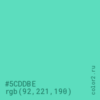 Цвет #5CDDBE в цветовой модели RGB обозначается тремя октетами (92, 221, 190) в десятичном формате и #5CDDBE в шестнадцатиричном (hex) формате, которые являются интенсивностью красного 92 (hex 5C), интенсивность зелёного 221 (hex DD) и интенсивность синего 190 (hex BE).